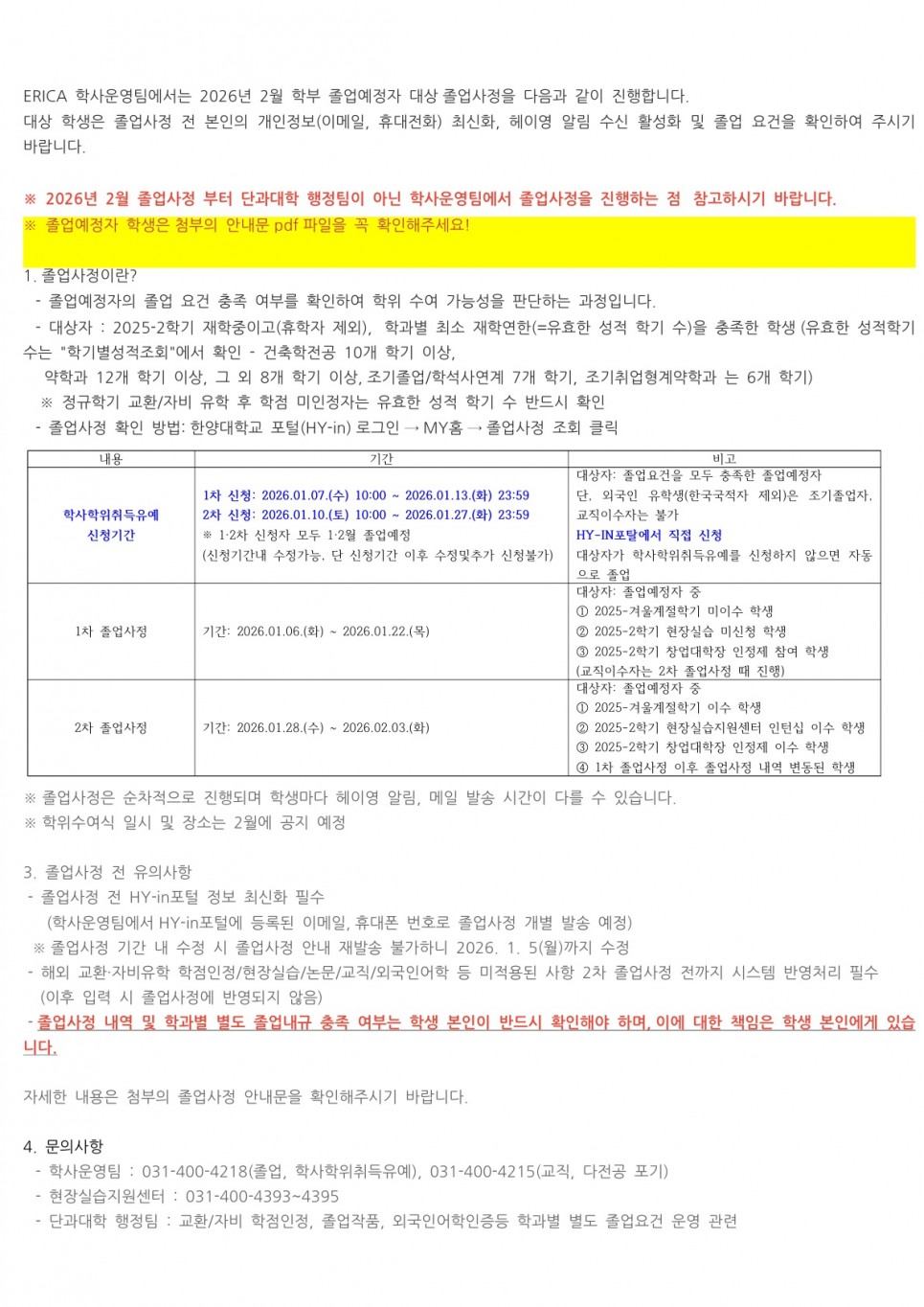 [학적] ERICA]2025학년도 전기(2026.2월) 졸업사정 일정 및 유의사항 안내