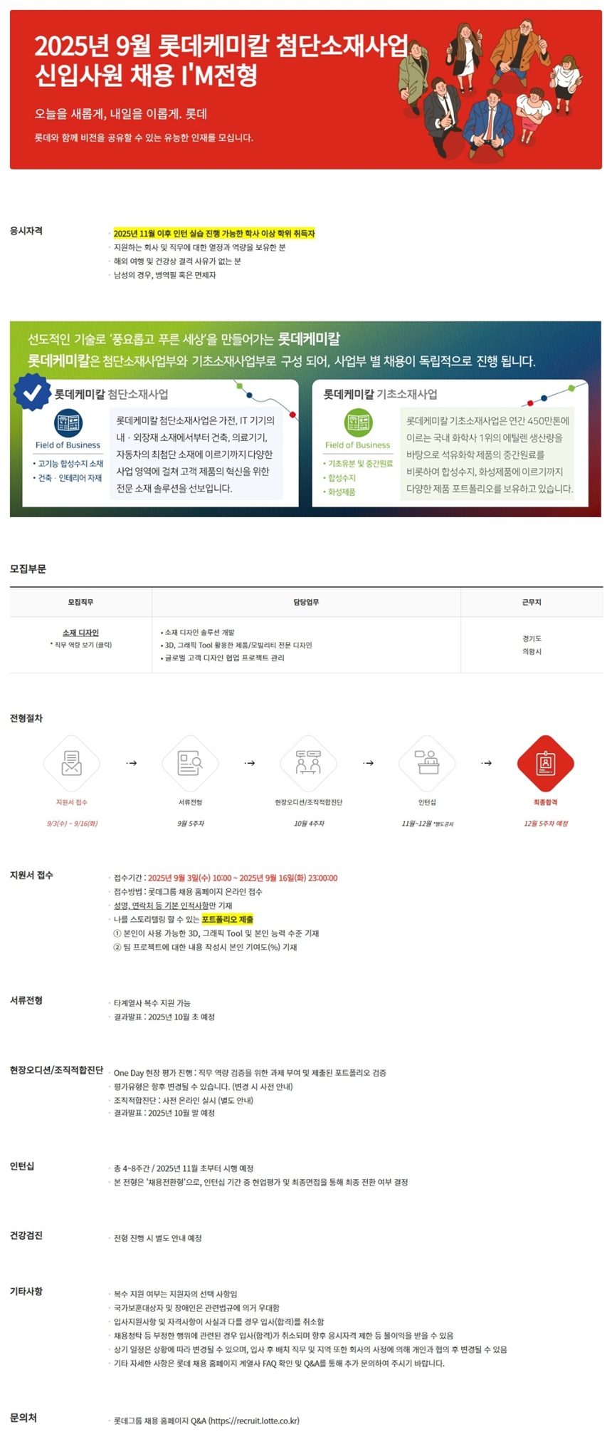 [취업·창업] 2025년 9월 롯데케미칼 첨단소재사업 신입사원 채용 I’M전형