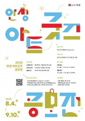 □ 공모개요ㅇ 공모기간2025. 8. 4.(월) ~ 9. 10.(수) 17:00ㅇ 참가자격전국 신진 공예·디자인 분야 창작자 (개인 또는 사업체)ㅇ 공모분야① 수공예 굿즈 : 핸드메이드·전통 공예기법 중심의 창작품② 디자인 굿즈 : 시각디자인·브랜딩 중심의 창작품③ 실험 굿즈 : 새로운 소재 및 표현 기법을 적용한 창작품ㅇ 지원혜택- 상품 개발비 총 1억 원 지원(50% 선지급)- 스타필드 안성 팝업 전시 및 현장 판매 기회 지원- 온라인 스마트스토어 입점 및 홍보 콘텐츠 제작 지원 등ㅇ 우대사항- 안성시 로컬 자원 활용 작품- 청…